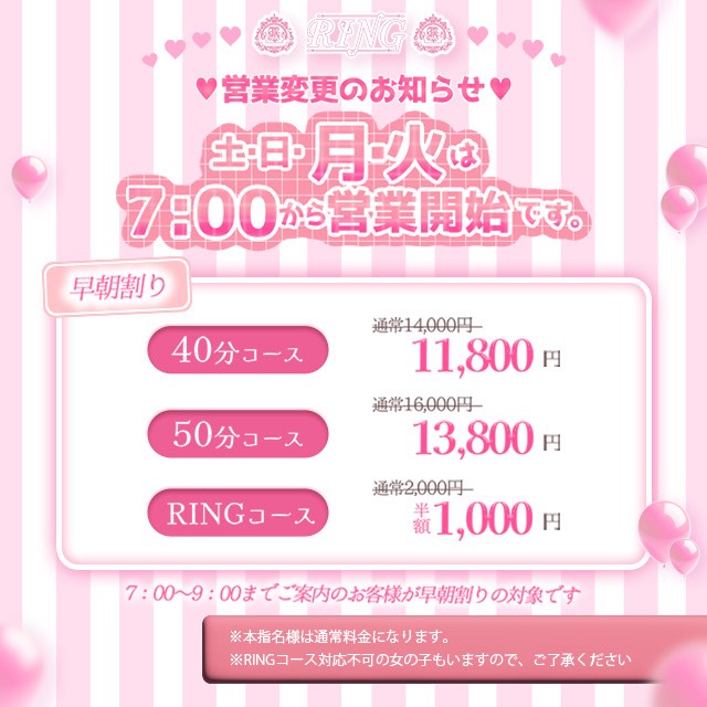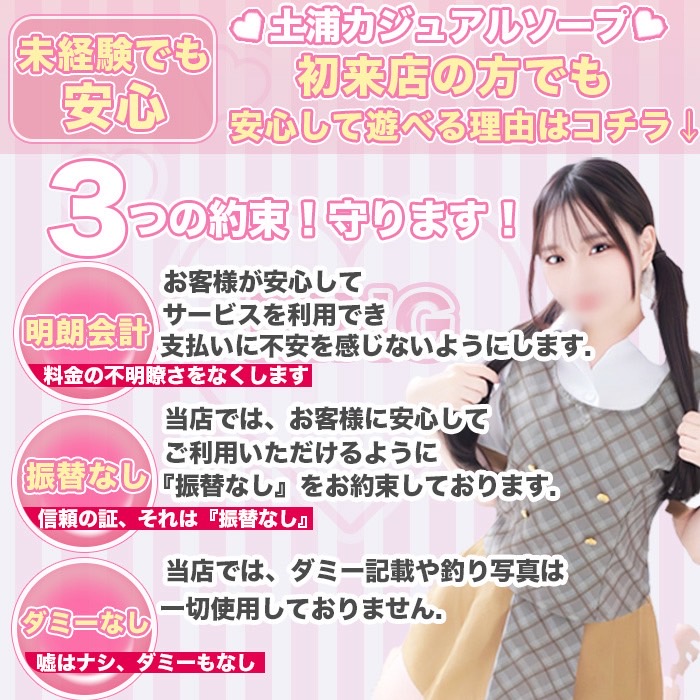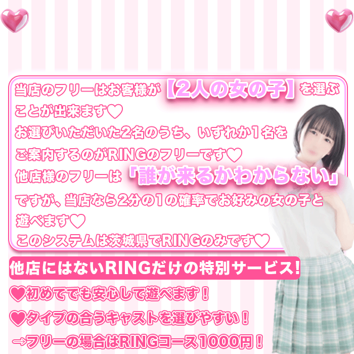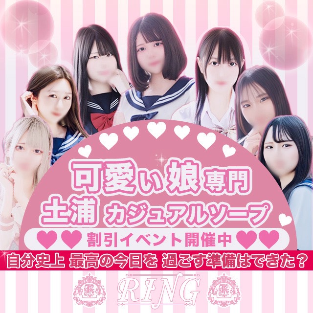 | 当店について | \土浦のアイドルソープ/ 容姿.性格を基準に厳選されたキャストで一生懸命なおもてなしをお届けする...それが【RING】一緒に居て良い時間を過ごせるような女の子で大切なお客様をエスコート致します。 RINGをご愛顧頂き誠にありがとうございます。 本日も当店自慢の豪華女の子でお客様をお出迎えさせて頂きます。 皆様のお早目の予約を従業員一同心よりお待ちしております。 何か聞きたい事などありましたら遠慮なくお問い合わせ下さい。 |